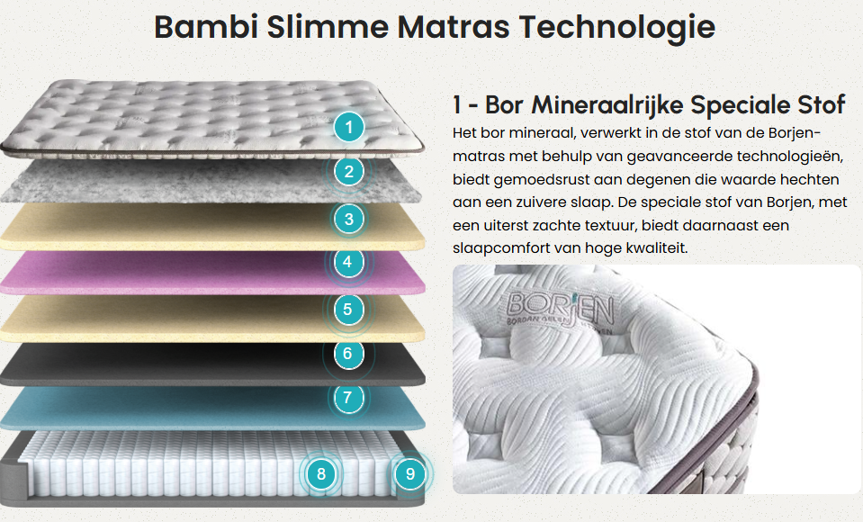 Deze matras is verrijkt met bormineralen, die helpen bij het creëren van een schone en comfortabele slaapomgeving. Dankzij de urenlange ervaring met bor en moderne technologie biedt deze matras unieke gezondheids- en slaapvoordelen die andere matrassen niet kunnen bieden.