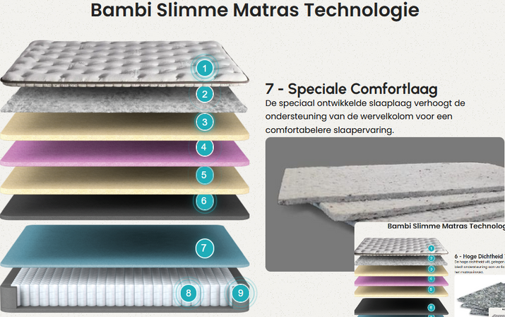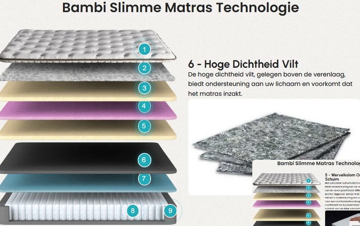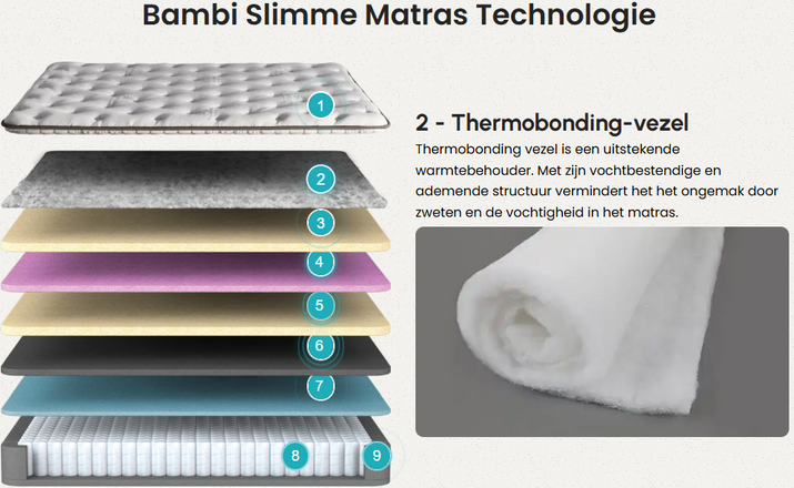 Antwoord 2: De poreuze structuur van de bamboevezels zorgt voor luchtcirculatie tussen de schuimlagen, wat helpt om de temperatuur en vochtigheid in balans te houden, zodat je comfortabel kunt slapen.