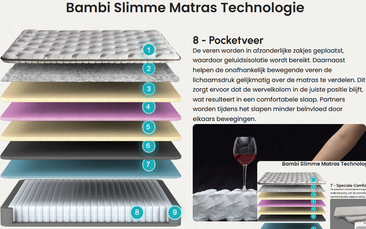 Antwoord 3: Ja, het pocketveringsysteem van het matras zorgt voor geluidsisolatie en verdeelt lichaamsdruk gelijkmatig, waardoor partners minder last van elkaars bewegingen hebben tijdens het slapen.